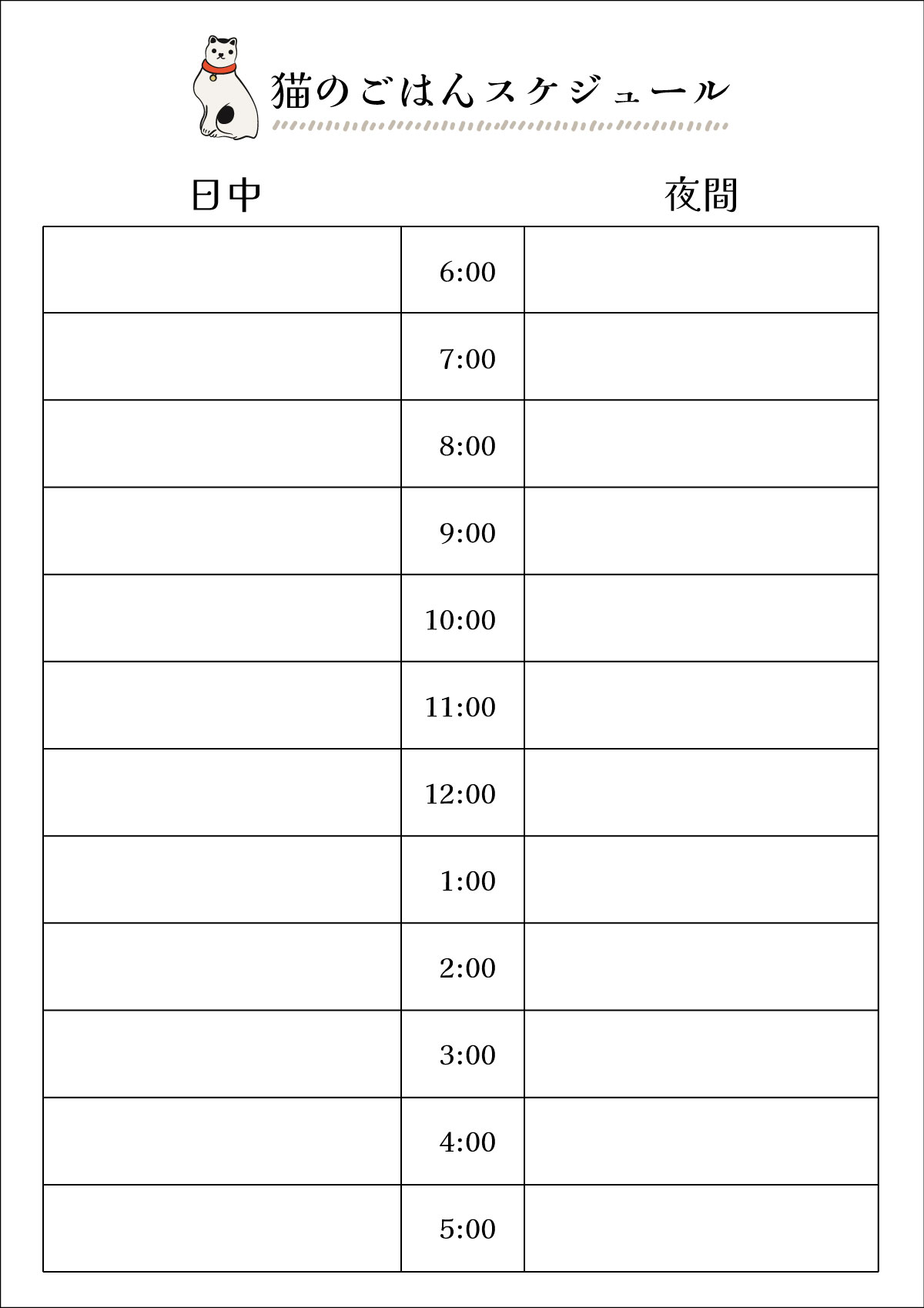TNR活動を円滑に進め、地域での苦情を減らすためには、置きエサをやめ、時間を決めて給餌することが不可欠です。外猫のお世話(エサやり)をしている方と、「いつ・どこで・どの猫が食べているか」を共有し、ルール化するためのスケジュール表です。