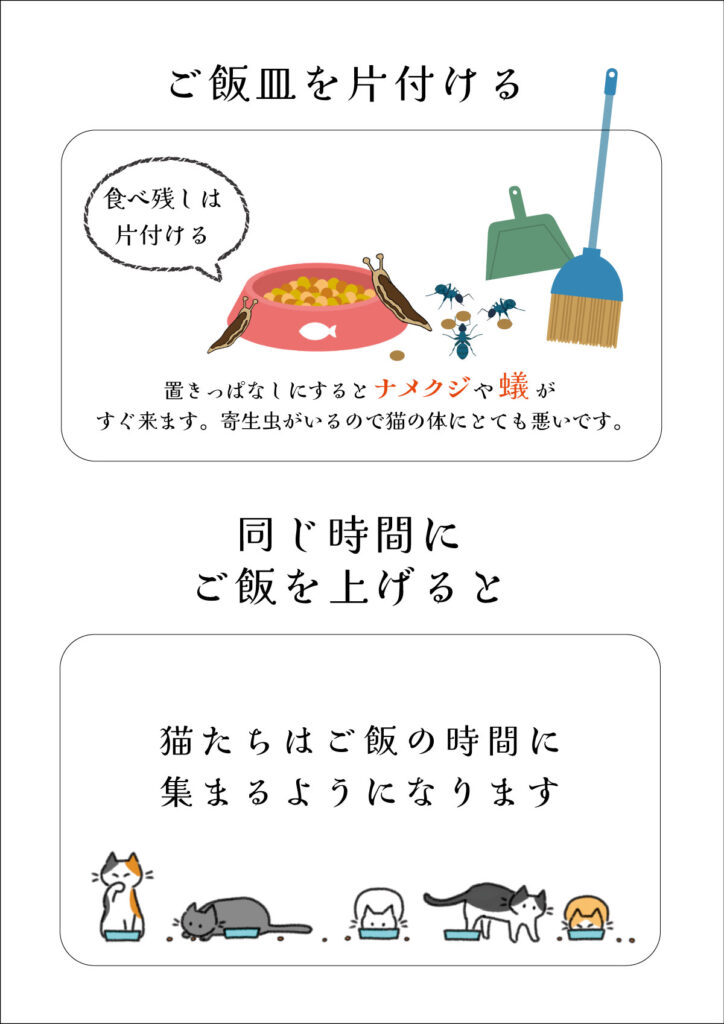 TNR活動を円滑に進め、地域での苦情を減らすためには、置きエサをやめ、時間を決めて給餌することが不可欠です。