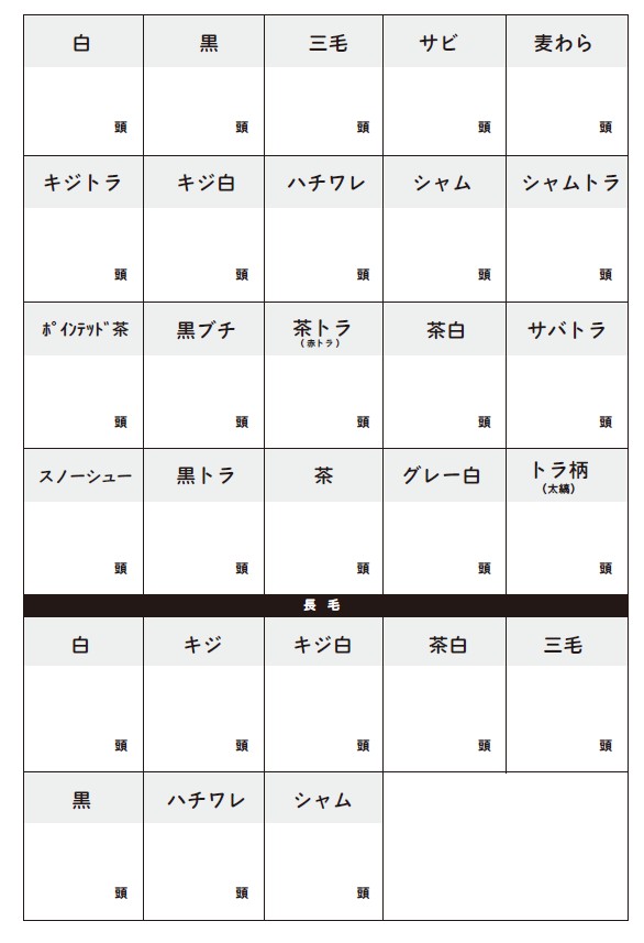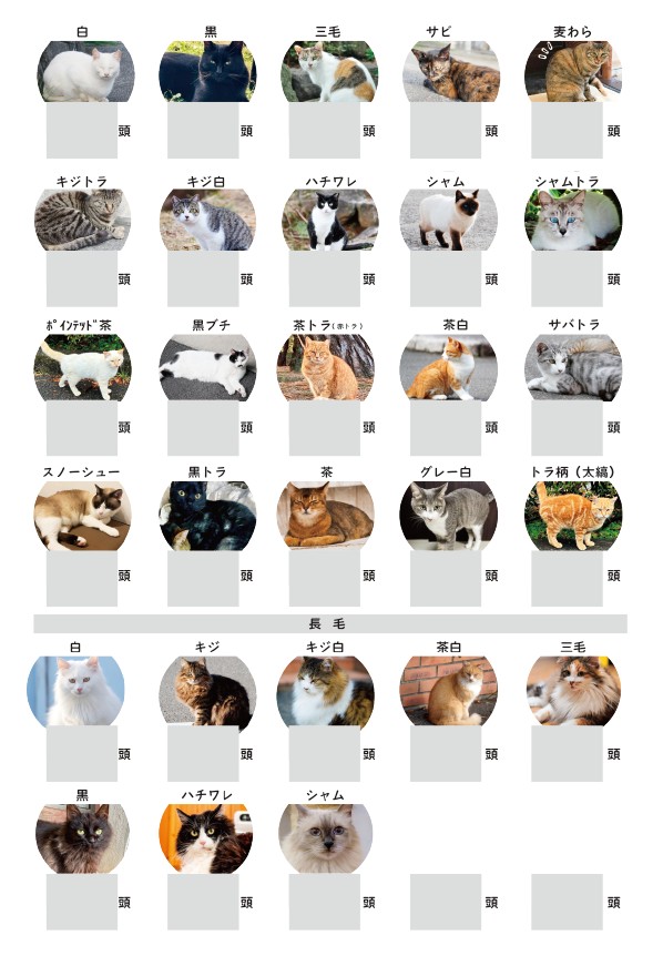 猫の柄見本 / 猫の数調査の際の利用、えさやりさんに猫の柄を聞く。