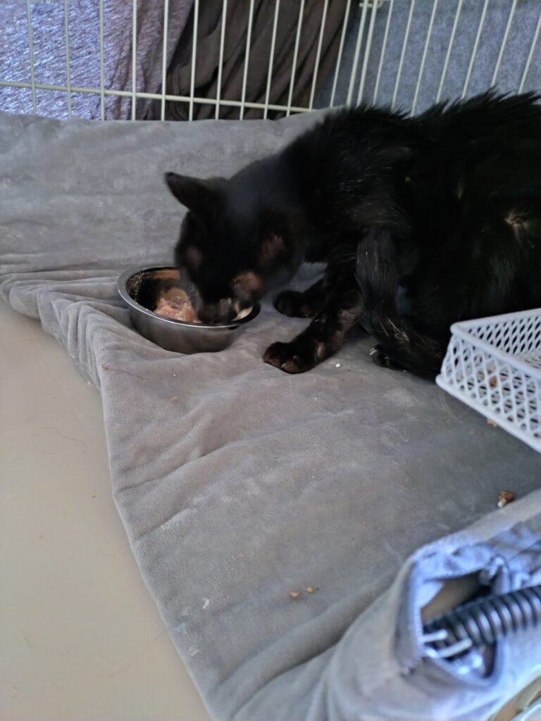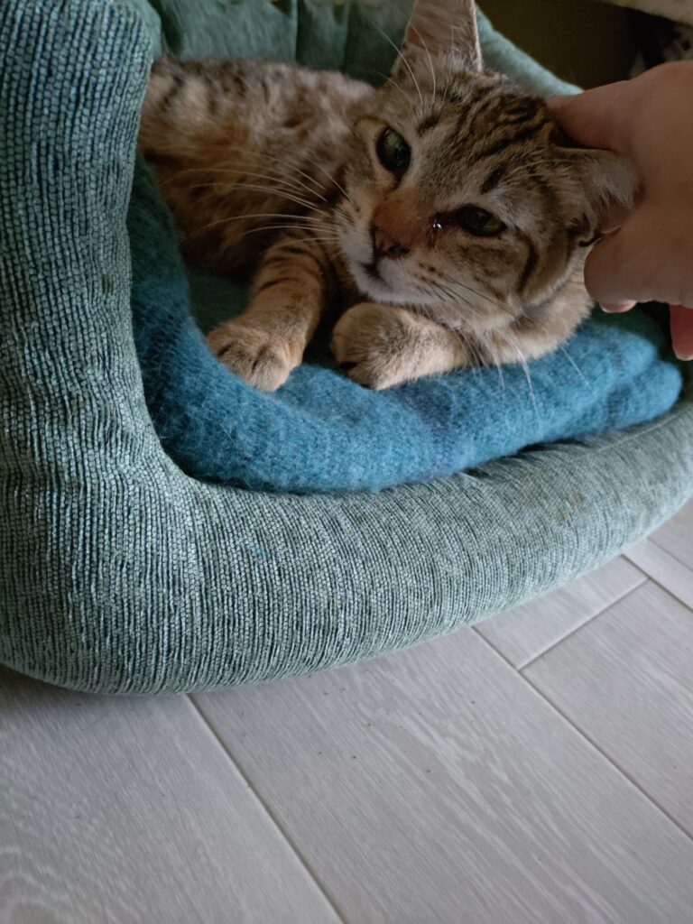 ・衰弱した成猫を保護。検査の結果、ダブルキャリアおよび貧血が確認されました。現在は風邪の治療と栄養補給を行っています。