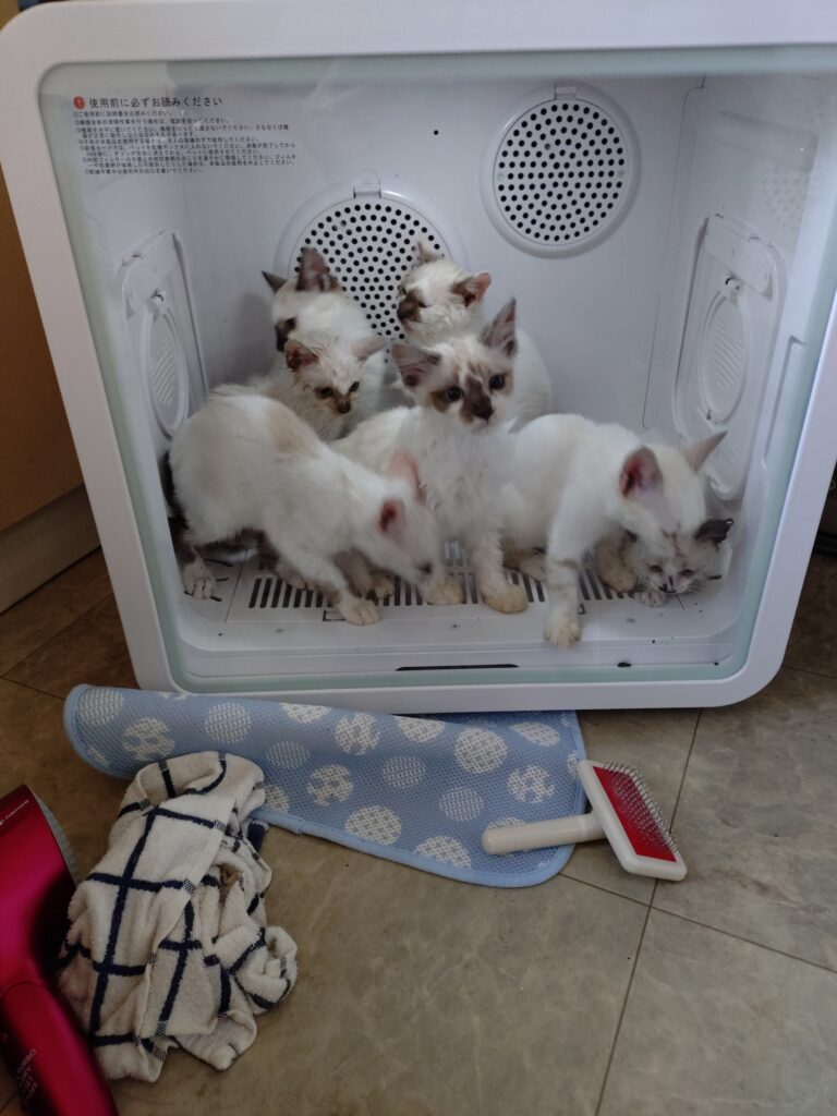 ・風邪をひいていて慣れている成猫を5頭保護しました。譲渡に向けて体調の管理をしていきます。