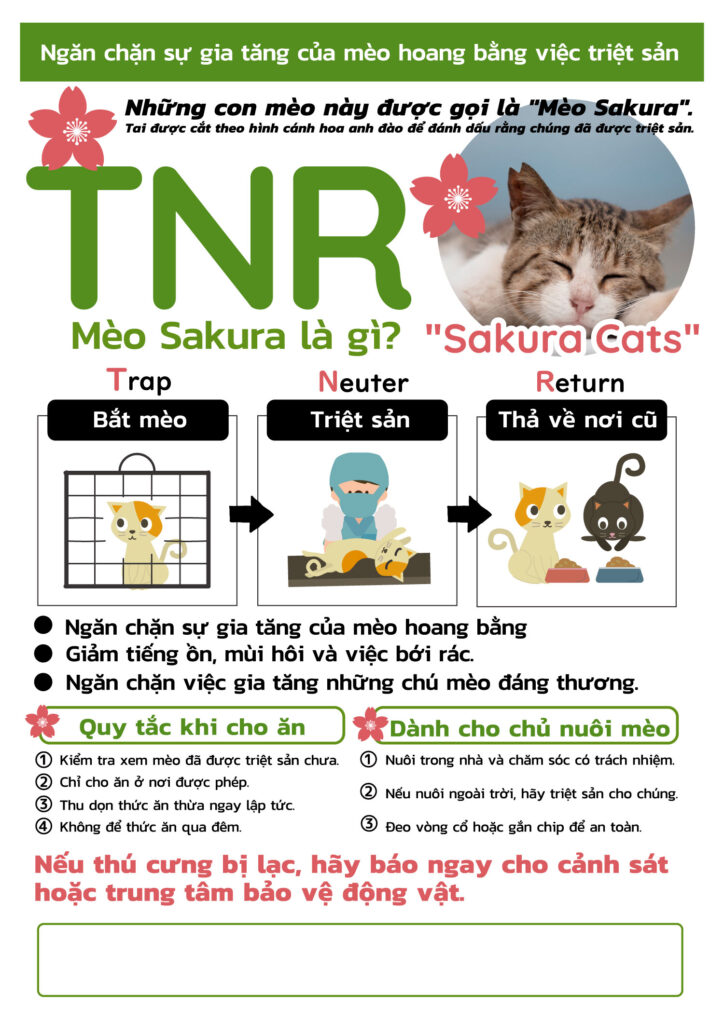 日本で生活するベトナムの方々にも、TNR活動(捕獲・不妊去勢手術・元の場所に戻す)の意義や「さくら猫」について正しく知ってもらうための多言語チラシです。 地域での猫トラブルを防ぎ、命を守る活動への理解と協力を広げるためにご活用ください。